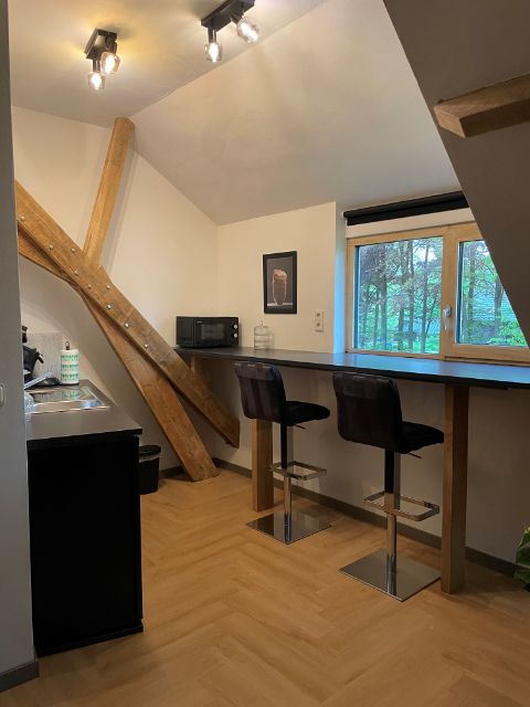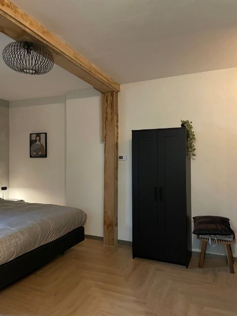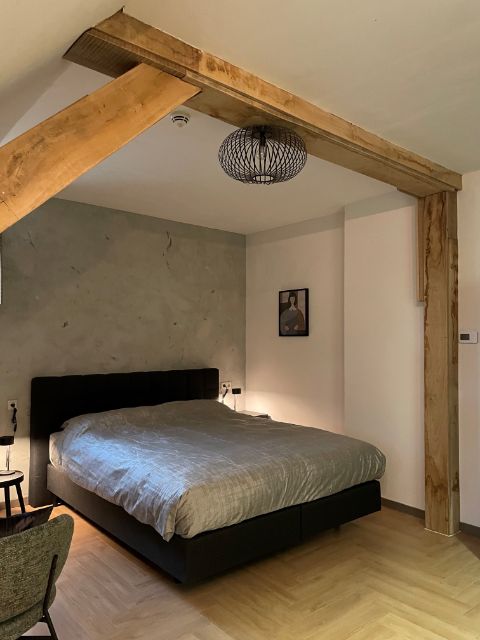 Deze 2-persoons studio (33 m2) is een fijne ruimte waar ook weer de natuurlijke materialen zijn gebruikt waar wij graag mee werken, zoals kalk, leem en eikenhout. Hierin bevindt zich een comfortabel bed van 2.20 m lang. Er is een zitje met TV en een kitchenette maakt de studio compleet; uitgerust met wasbak, kookplaat, koelkast en magnetron. De eigen badkamer beschikt over een wc, douche en wasgelegenheid.